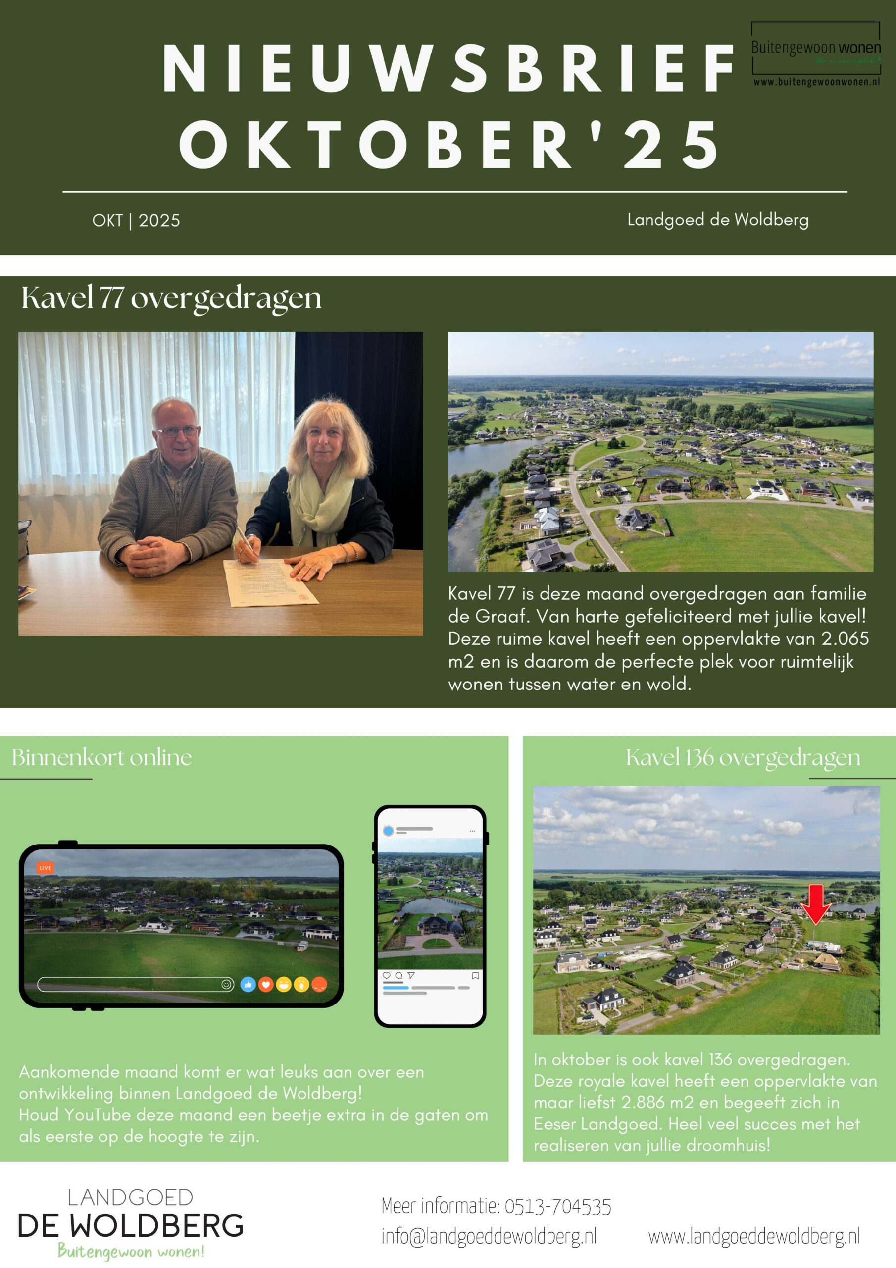 Beste nieuwsbrieflezer, De nieuwsbrief van oktober staat online! Landgoed de Woldberg is heerlijk wonen op een unieke locatie! Heeft u vragen of bent u benieuwd naar de mogelijkheden? Neem vrijblijvend contact met ons op! Voortaan de nieuwsbrief als eerst in uw mailbox ontvangen? Aanmelden voor de nieuwsbrief kan via https://landgoeddewoldberg.nl/nieuwsberichten/